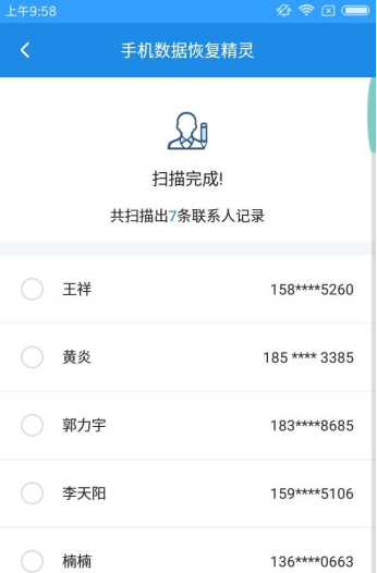 4、我們掃描結束以后,可看到之前所刪除的聯系人列表了,然后選擇需要恢復的點擊下方的恢復即可。