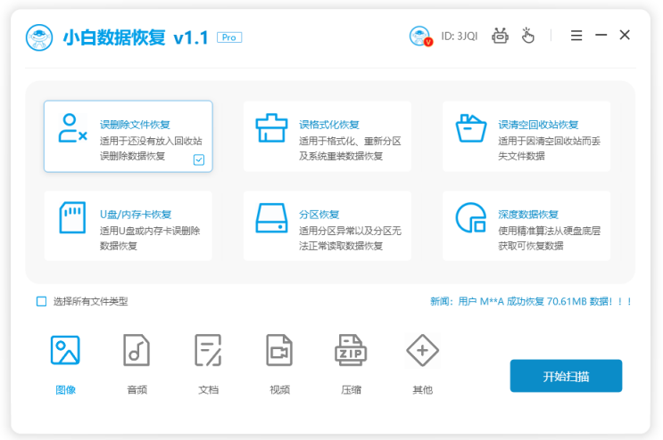 3、安裝并打開軟件:在安裝完成后,打開小白數據恢復軟件,根據需要選擇需要的恢復功能,開始掃描。