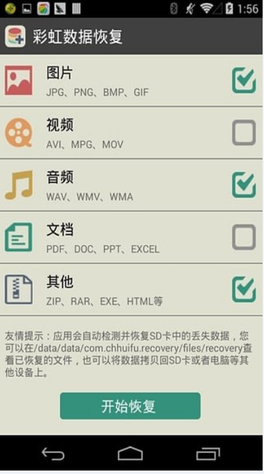 彩虹數據恢復app是一款免費可以幫助用戶恢復手機中各種誤刪的數據文件,如視頻和圖片等,其恢復的成功率非常高,且操作起來也十分的簡單方便,是大家手機中不可多得的必備神器喲!