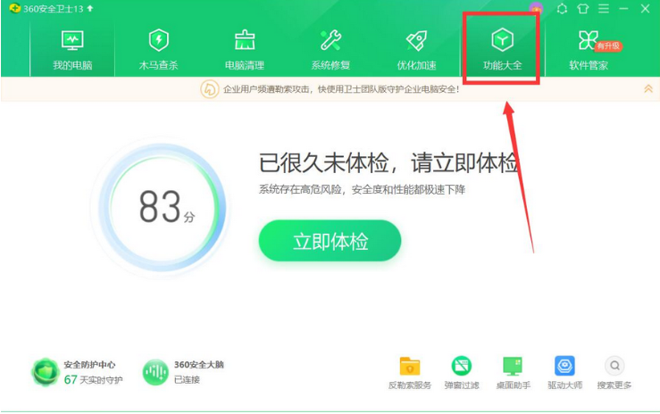 1、首先在電腦上安裝并打開360安全衛士,打開軟件后點擊上方的“功能大全”。