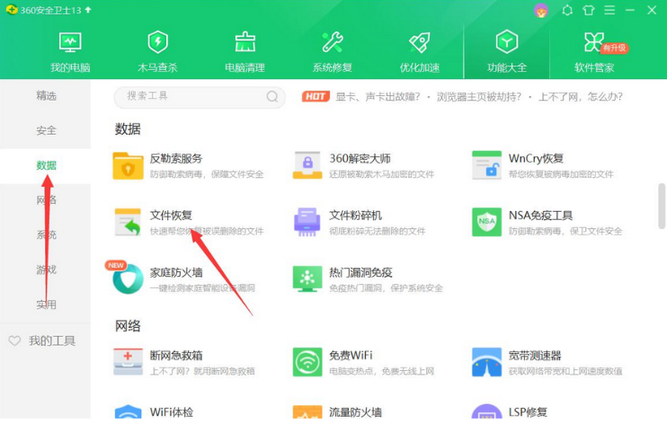 2、點擊左側的“數據”,選擇其中的“文件恢復”點擊添加,即可下載安裝好360u盤數據恢復工具。