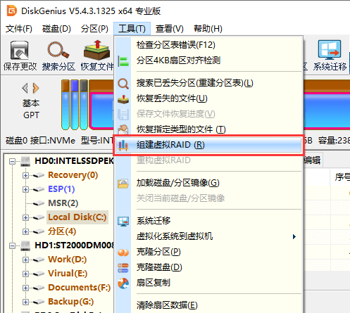 1、ibm服務器如何恢復數據,首先打開DiskGenius專業版,點擊"工具" – "組建虛擬RAID"菜單項。開始操作之前,需要將磁盤陣列中的硬盤接到軟件所在的電腦上,在DiskGenius軟件可以看到這些硬盤。
