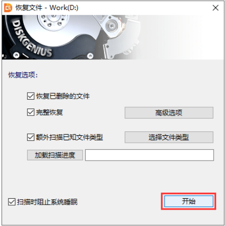 3、當程序彈出恢復文件對話框后,點擊“開始”按鈕,讓軟件開始對該分區進行深度掃描。在掃描期間,丟失的文件會被陸續找到并顯示在軟件中。如果發現需要恢復的文件已經找到了,可以提前結束掃描任務。