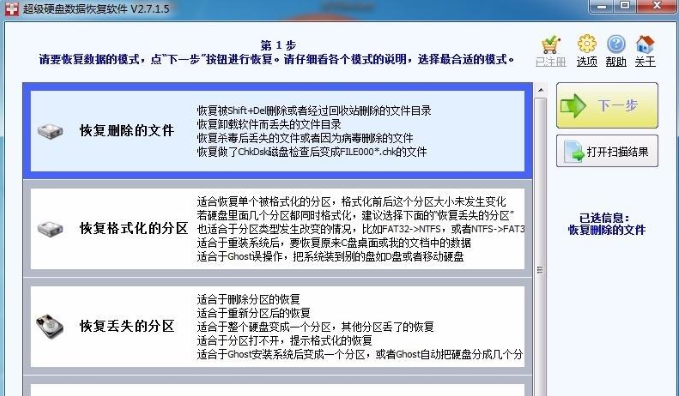 1、首先在電腦打開超級硬盤數據恢復軟件,在界面就可以選擇需要的功能進入下一步,這里以“恢復刪除的文件”為例。