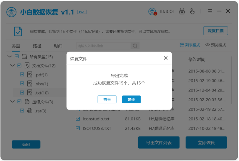 3、等待軟件掃描完成,軟件會列出能恢復的數據資料,我們可通過文件類型/大小/路徑等方式快速篩選出所需文件,點擊“立即恢復”。