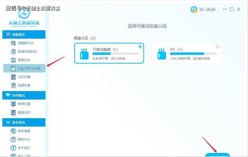 2、緊接著在【場景模式】下選擇【U盤/內存卡恢復】,選擇格式化的u盤,點擊【開始掃描】。