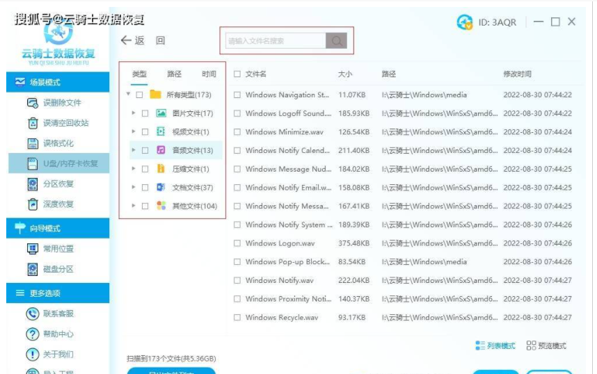 3、文件掃描工作結束后,在文件類型、文件大小、文件名等等方式下找到所需文件。