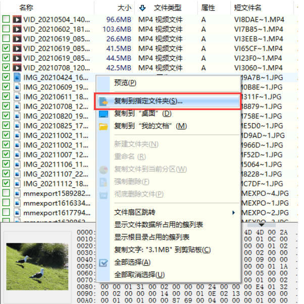 5、在掃描結果中挑選恢復的數據,右擊選中的文件并選擇"復制到指定文件夾"選項,可根據軟件提示在電腦硬盤或是其他設備上設置文件夾來保存恢復的數據。