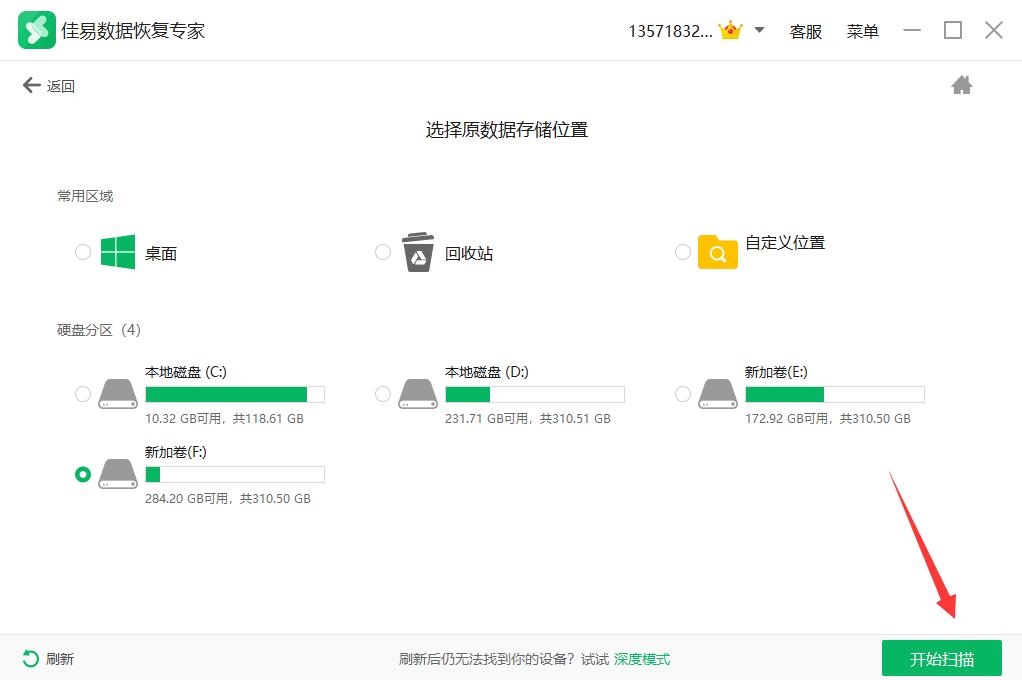 2、然后選擇刪除文件的原存儲位置,選好點擊“開始掃描”。