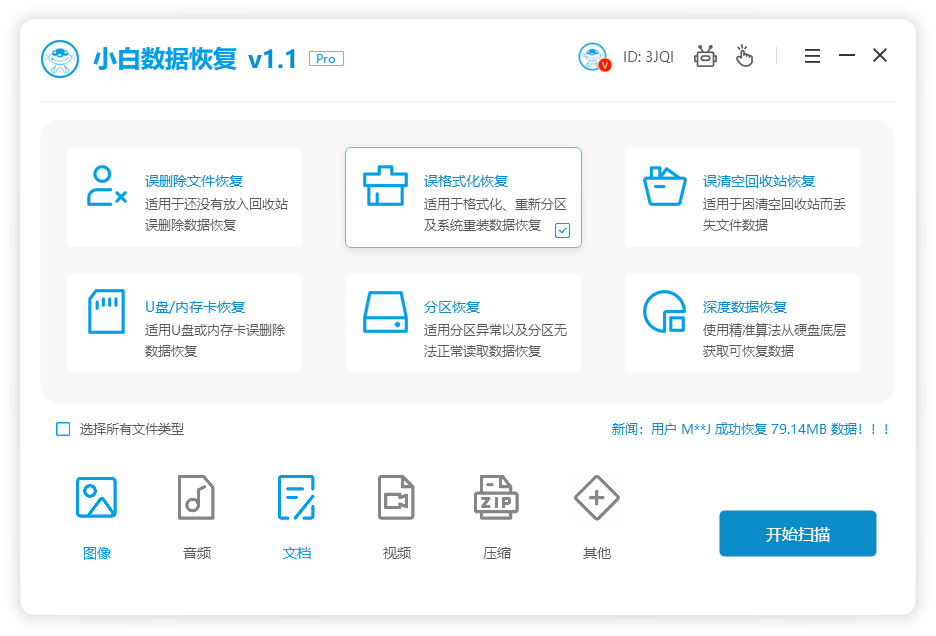 1、下載安裝小白數據恢復工具,打開后選擇誤格式化恢復,點擊開始掃描。