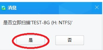 3、彈出對話框,提示“是否掃描TEST-8G(H:NTFS)”,點“是”,軟件掃描H分區數據。