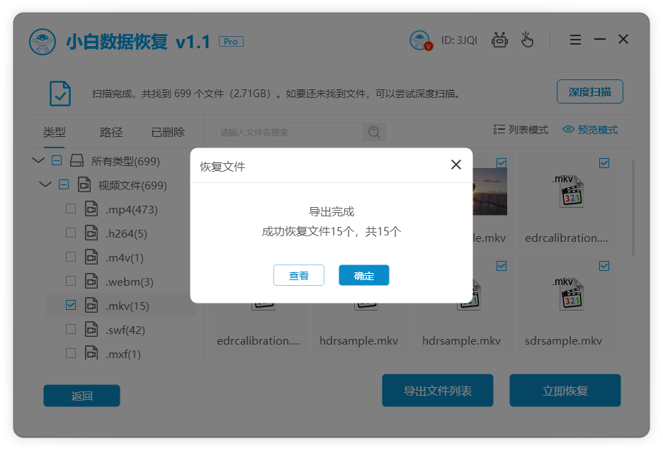 10、下圖為剛才恢復的文件??梢钥吹剑瑒偛殴催x的文件已經全部恢復成功,恢復出來的視頻可以正常預覽、打開。