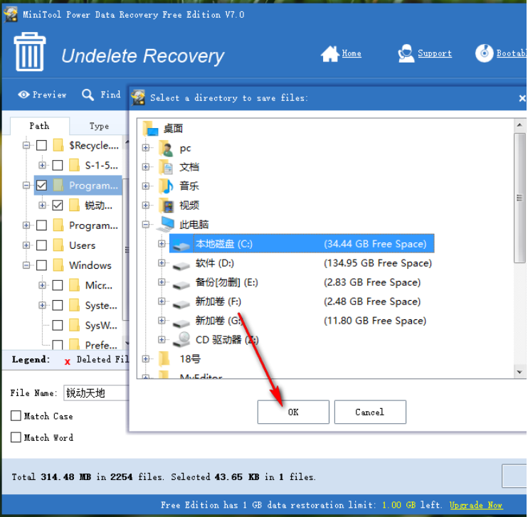 7、點擊這個Save按鈕之后會出現一個選擇文件儲存位置的界面,我們選中想要儲存恢復文件的位置之后點擊下方的OK按鈕即可進行恢復。