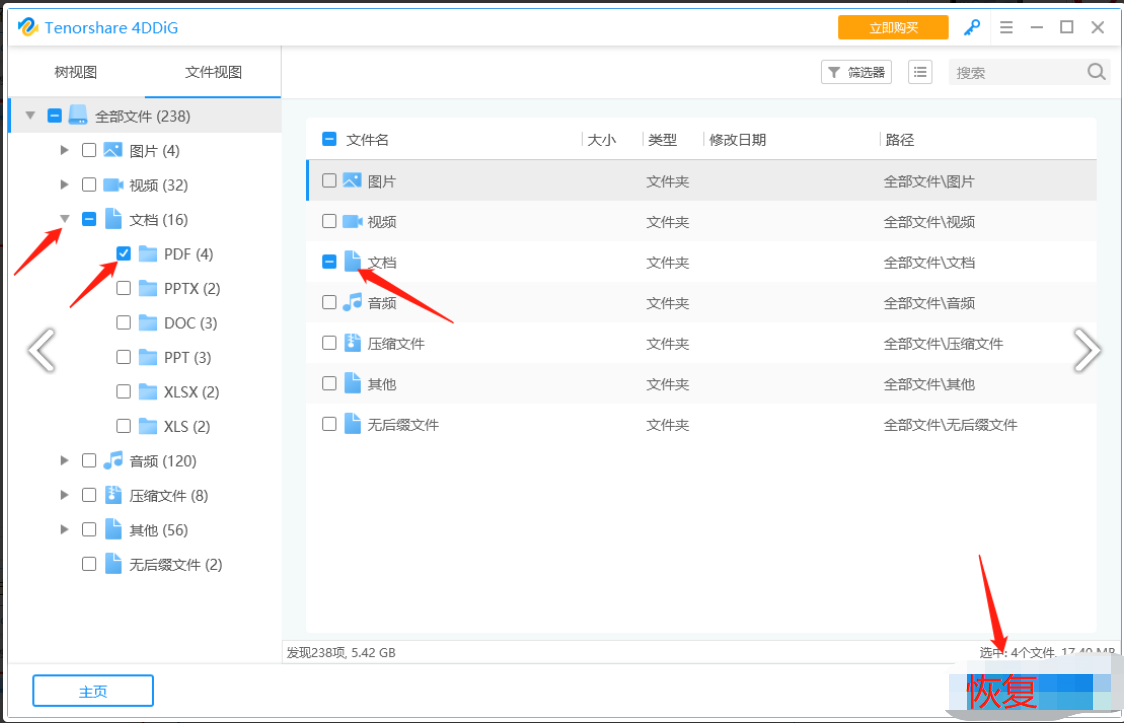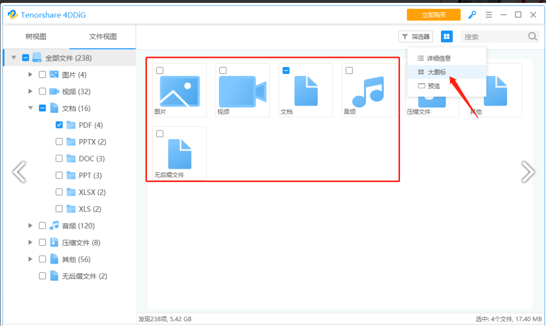 4、或者點擊【文件視圖】選項,在該選項下你可以通過文件的類型來選擇自己想要恢復的文件。