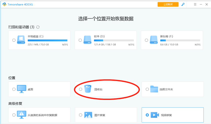 1、首先我們可以將軟件雙擊打開,在打開的主頁中有幾種掃描類型,選擇回收站進行掃描。