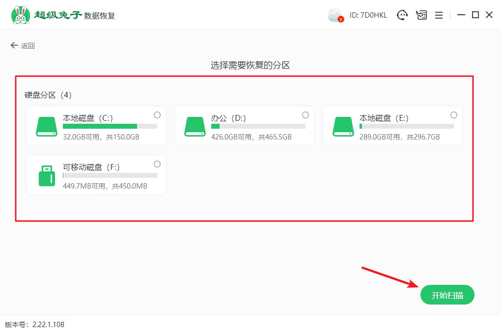 2. 選擇需要恢復的分區位置,再點擊右下方的“開始掃描”按鈕。
