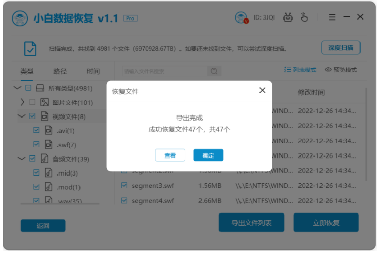 3、當數據掃描完成后,選擇需要恢復的文件類型,點擊立即恢復。