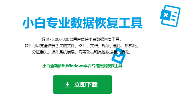 2、在電腦上輸入“小白數據恢復軟件”進入官網并下載軟件安裝到電腦。下載入口:小白數據恢復軟件下載