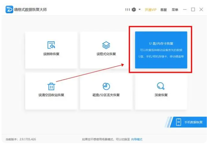 第一步:運行電腦中的【嗨格式數據恢復大師】,點擊選擇“U盤/內存卡恢復”模式;