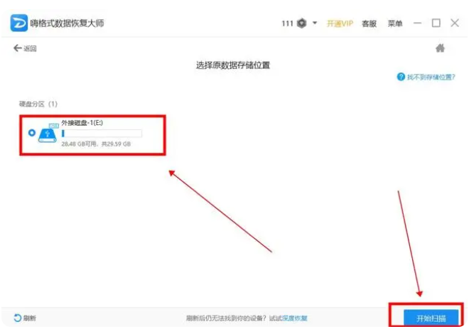 第二步:在該模式下點擊選擇需要恢復數據的硬盤,點擊下面的“開始掃描”按鈕;