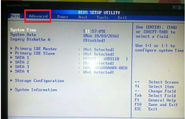 2、進入bios界面后選擇上方的“Advanced”選項卡。