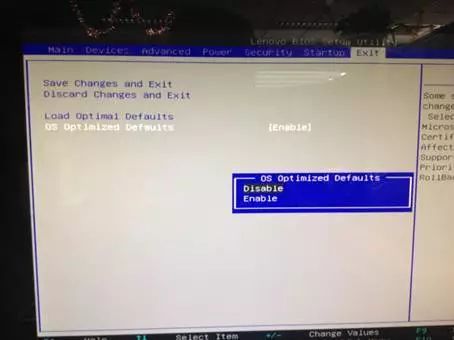 1、進入Bios界面,按鍵盤上的右方向鍵(→)選擇到Exit;按鍵盤上的下方向鍵(↓)選擇到 OS Optimized Default,按下enter選擇Disabled