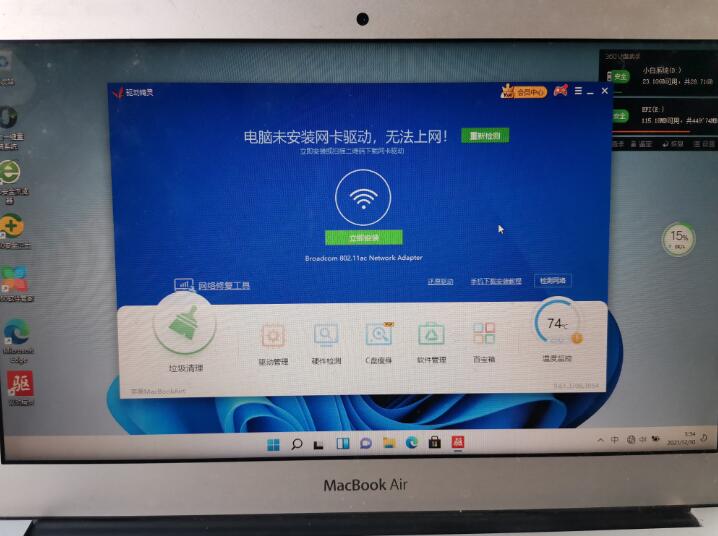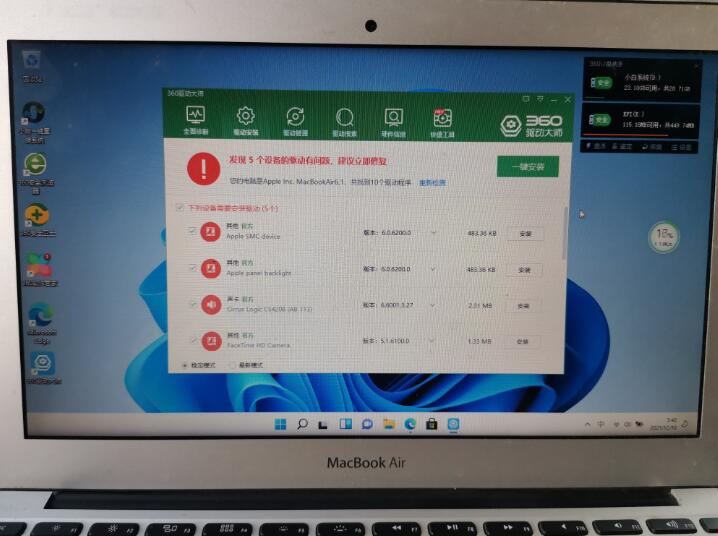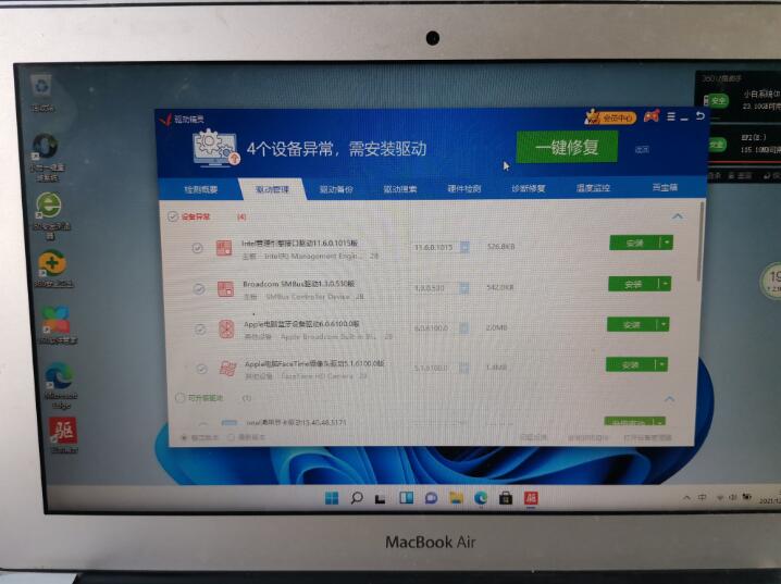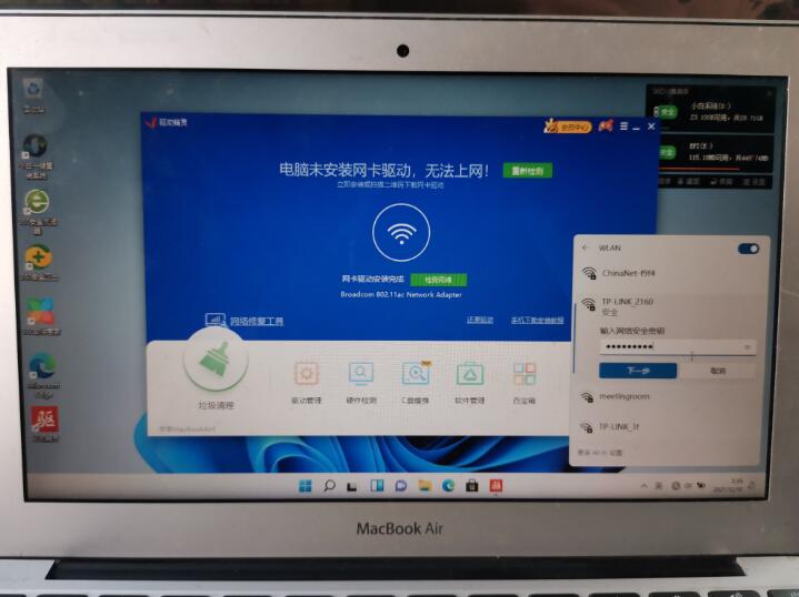 1、正常進入到 Windows 11 系統后您的電腦可能無法聯網,這個時候插上 U 盤,把下載備用的驅動精靈網卡版和驅動人生網卡版以及蘋果 Windows 驅動包拷貝到電腦中。安裝驅動精靈網卡版更新驅動,然后正常聯網并更新相關驅動。