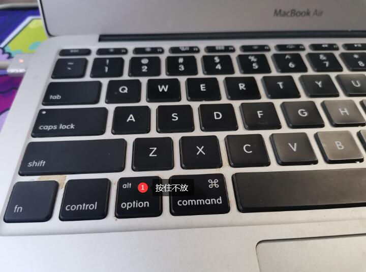 1、插上制作好的啟動 U 盤,MacBook Air 電腦開機的時候按住 Option 鍵不放,當出現蘋果 Logo 時松開。