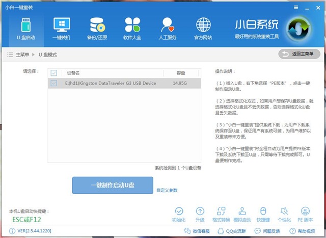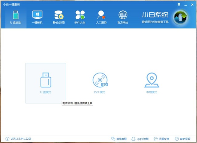 1、首先我們下載小白一鍵重裝大師,在U盤啟動界面,點擊U盤模式