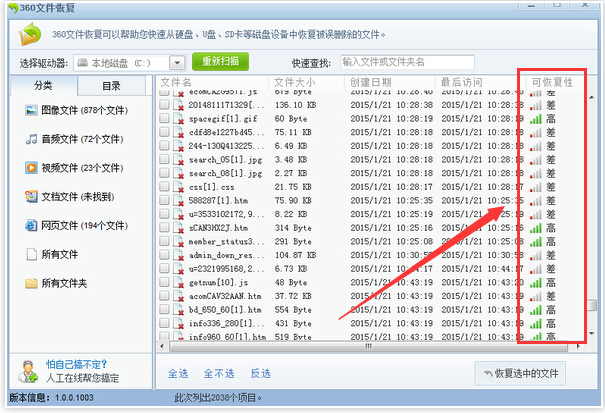 4、掃描完成后360文件恢復功能會顯示丟失文件的情況,我們看到可恢復性分為幾個級別,我們可以選擇自己想要恢復的文件嘗試進行恢復。另外還有一種是文件夾可恢復性為空白的,此文件夾是可以恢復的,不過文件夾內部的文件可能已經被擦寫,文件夾恢復后不一定能夠找到想要的文件