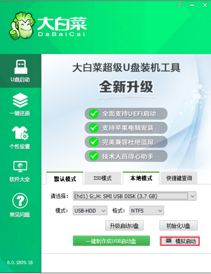 1、 下載并安裝好大白菜裝機版,打開軟件并插入U盤。 選擇“默認模式”,在磁盤列表中選擇需要制作啟動的設備,在模式選項中選擇“USB-HDD”,格式選擇“NTFS”