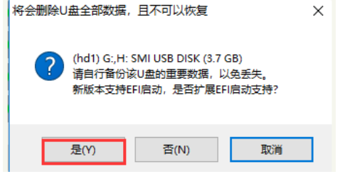 3、 在彈出的信息提示窗口中,點擊“是”(注:制作啟動盤會格式化U盤,請提前備份好U盤數據!)