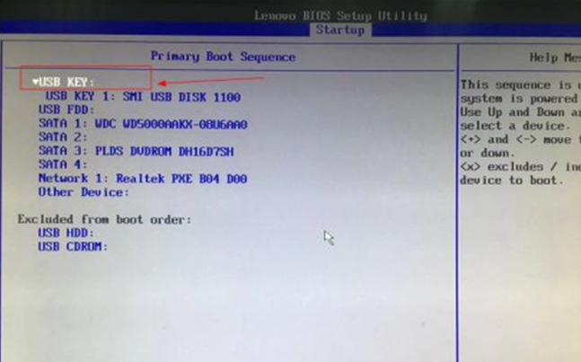 6、進入設置明細界面,通過按小鍵盤的“+”和“-”(加減號)來實現順序的改變,將usb key 設置為第一個,有的電腦可以能是usb Hdd。