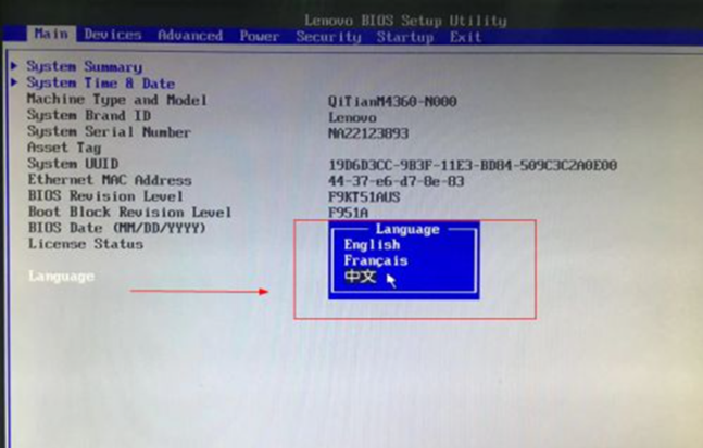 8、若是BIOS帶有語言選項,對英文不熟悉的,也可以在MAIN中選擇Language語言選項,將語言設置為中文界面進行操作。