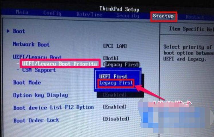 4,然后再選擇Startup(啟動項)這一項,先在里面選擇UEFI/Legacy Boot這一項,其中文之意是“新式UEFI與傳統啟動方法”,現在里面顯示的是"UEFI Only(單一UEFI模式)",我們要選擇兼容模式,也就是要兼容傳統BIOS模式,所以按Enter進入,選擇Both這項,按Enter確定。