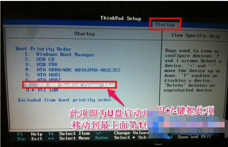 7,進入啟動選項界面后,選擇USB HDD SanDisk Cruzer Edge這一項,即U盤啟動項,先把光標移到這一項來,然后用+/-鍵,把這一項移動到最上面,讓它排在第1位,這樣,它就是第一啟動項了,按Enter鍵確定。