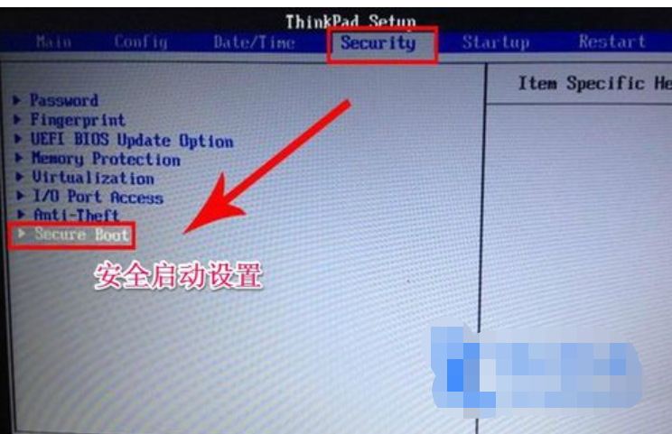 2,進入BIOS主界面之后,默認顯示的是Main這一項,先把光標移動到Security(安全)這一項來,然后用上下方向鍵,把光標移到“Security Boot”,其中文意思是“安全啟動設置”,如果要用傳統方法啟動U盤,必須對此項進行設置,按Enter鍵進入。