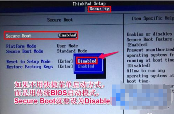 3,進入到子頁面后,選擇其中的Secure Boot這一項,按Enter打開小窗口,選擇Disabled(關閉)這一項,再按Enter確定。