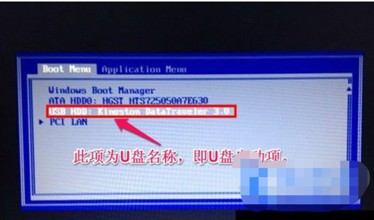 2,會顯示出一個啟動菜單,在顯示的啟動菜單中,將光標移動到圖中紅框選中的項,然后按Enter鍵確定,即可進入U盤。