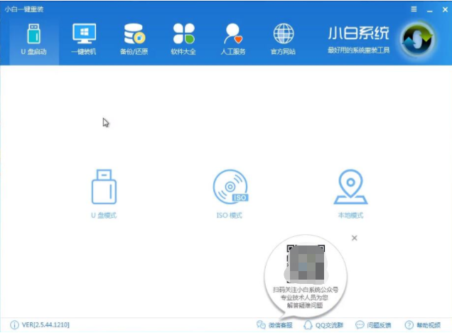 1、把U盤插到電腦USB接口,運行小白一鍵重裝系統軟件,切換到U盤啟動再點擊U盤模式。