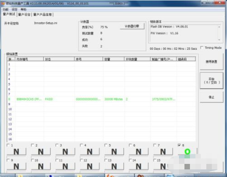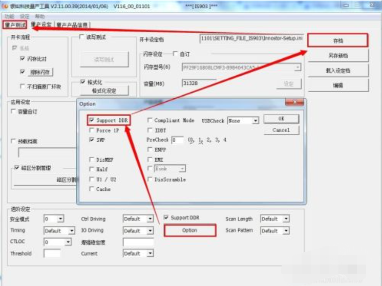 3、點擊【option】再選擇【Support DDR】點擊【OK】、【存檔】、返回到【量產測試】界面中。點擊【開始】。提示量產成功。