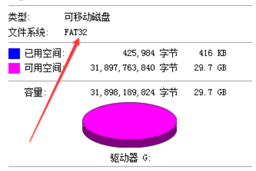 2、接下來我們“右鍵”電腦上新加的磁盤—>選擇“屬性”,就可以查看其詳細信息,我們發現其文件系統為FAT32,是不能傳輸單個大于4GB的文件。
