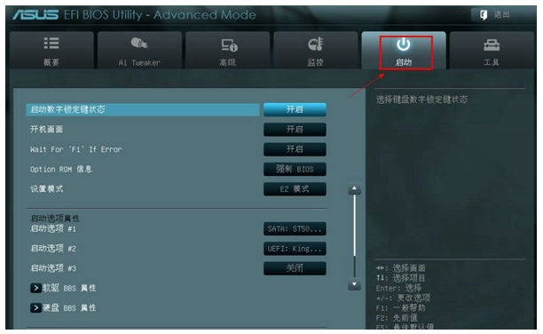 2、用鍵盤的“左右方向鍵”切換到“啟動”子菜單中。