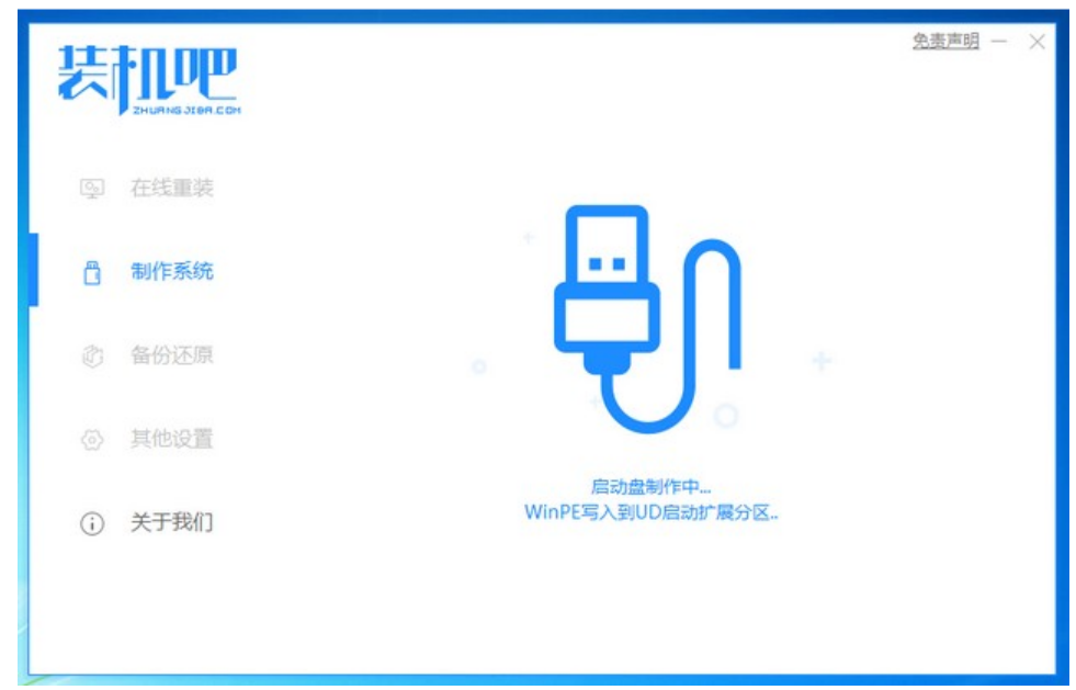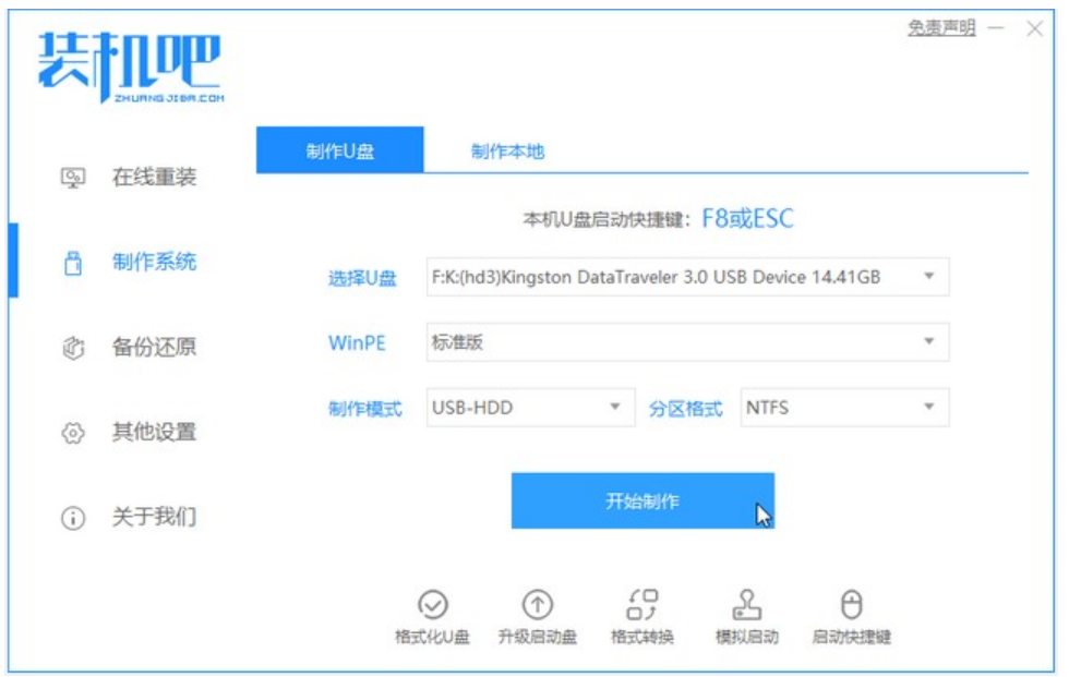 1、下載一個裝機吧一鍵重裝系統軟件并打開。插入一個空U盤,大小在8g或以上,在制作U盤中選擇您的U盤,其它參數默認直接開始制作即可。