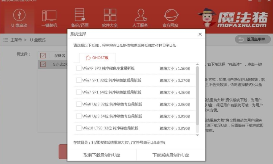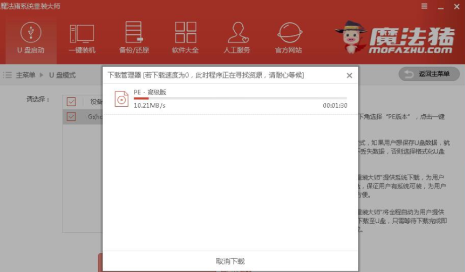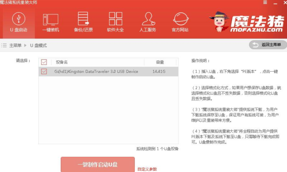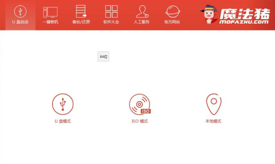 1.把U盤插到電腦USB接口,運行魔法豬系統重裝大師軟件,切換到U盤啟動——點擊U盤模式。