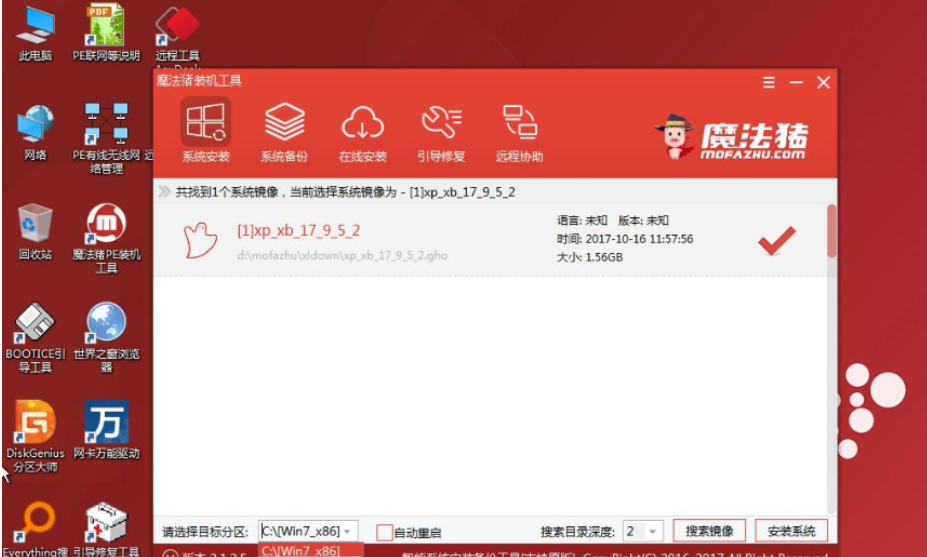 8.進入到PE系統桌面后會自動彈出PE裝機工具,這里勾選下載的 系統,目標分區選擇你的系統盤(一般為C盤),之后點擊安裝系統。