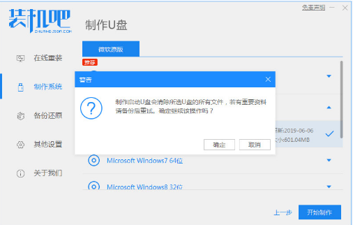 1. 在網上下載安裝裝機吧一鍵重裝系統軟件并打開。插入一個8GB以上的u盤。選擇制作系統,在制作u盤中選擇您的u盤,其它參數默認,選擇開始制作。