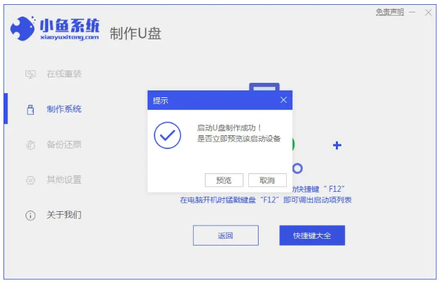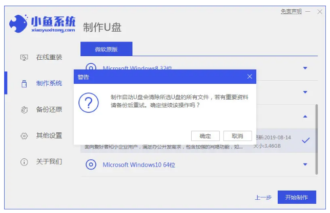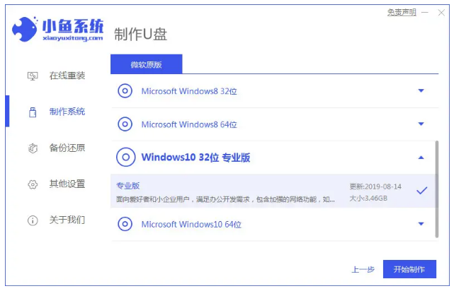 2.然后進入小魚系統的制作系統軟件,選擇制作u盤選項,點擊開始制作,系統會自動給出適合安裝的版本。