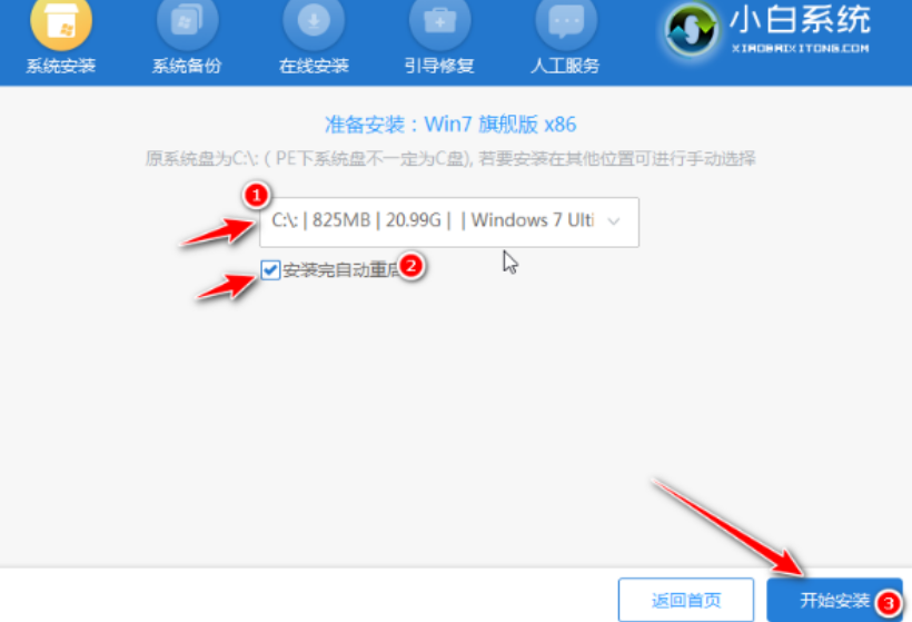 6、一般是默認將系統安裝到系統盤c盤,點擊開始安裝。