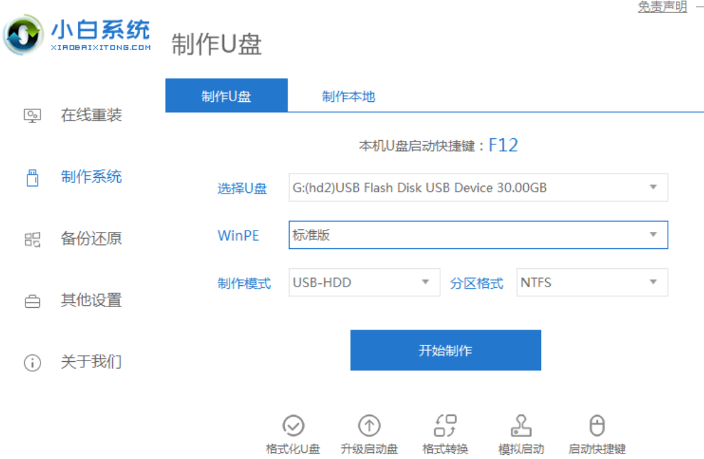 1、下載安裝“小白一鍵重裝系統”工具并打開,插入一個8g以上的空白u盤,選擇u盤重裝系統模式點擊開始制作。